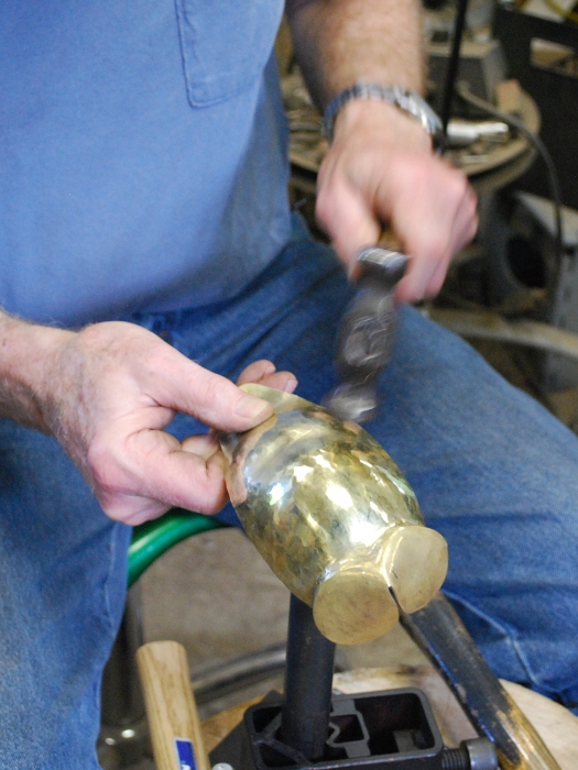 22. Using a large ball stake to do the final forming/planishing. I decided to keep the indentation below where the belly was pushed out. It's just the right place for the owl's perch.