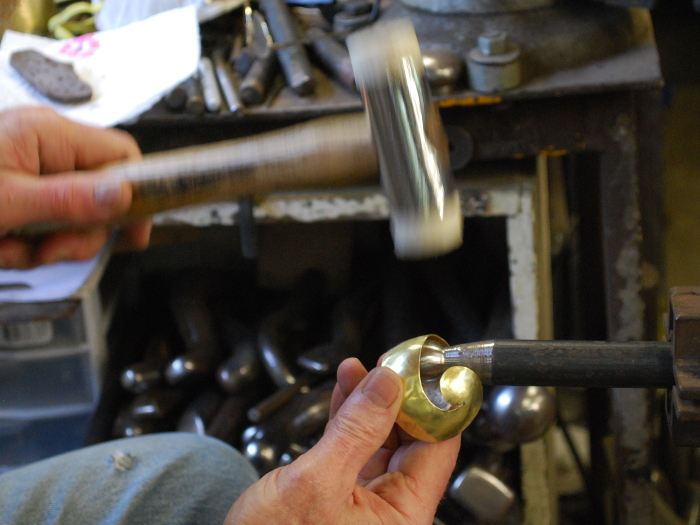 54. The piece of brass cut out, it's now being shaped on a ball stake.