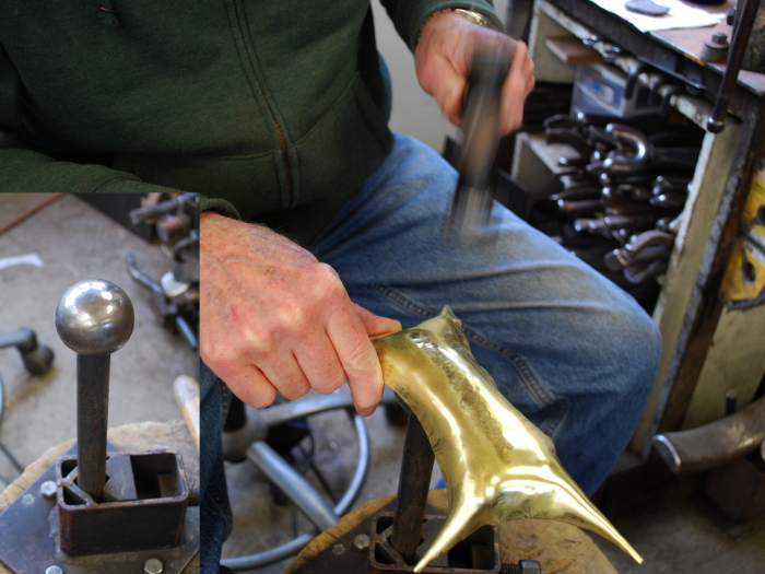 4. I didn't get pictures of a lot of the earliest forming. All the pointed parts have been formed, using the technique shown in picture #7. Here I am using the ball stake shown in the inset to round out the body.